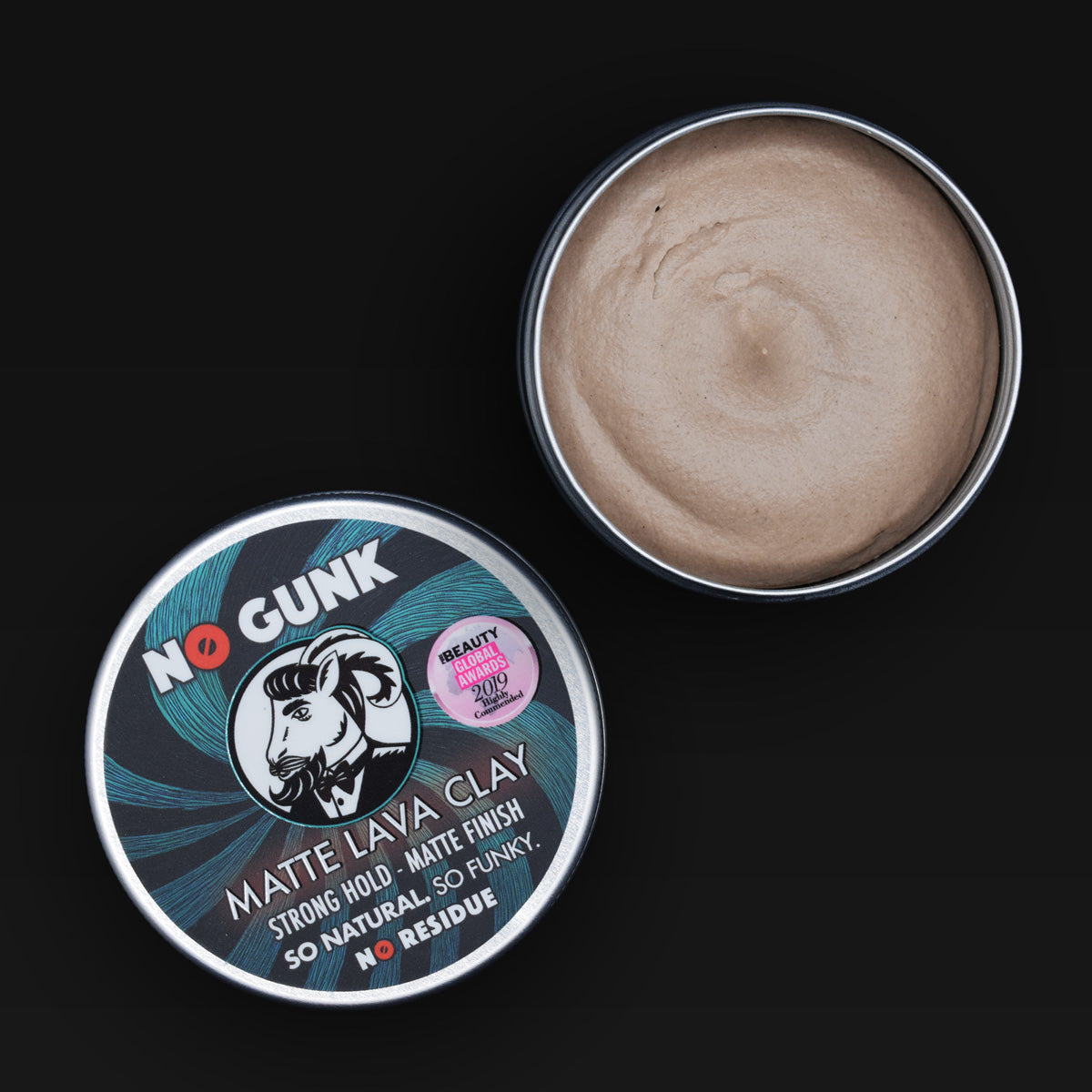 Introducing the NEW NO GUNK Matte Lava Clay: A natural hair clay made with mineral rich Moroccan Lava Clay. Expect a textured natural look with a matte finish. This highly natural matte hair clay offers unmatched nourishment and style in an eco-friendly aluminium tin that fits in your pocket, perfect for travel & on the go. With its supple lightweight consistency, there's no residue on your hands or hair after use. It smells so good you might even be tempted to eat it. Join the Matte Lava Clay revolution Funky Fellas. JUST FUNK!